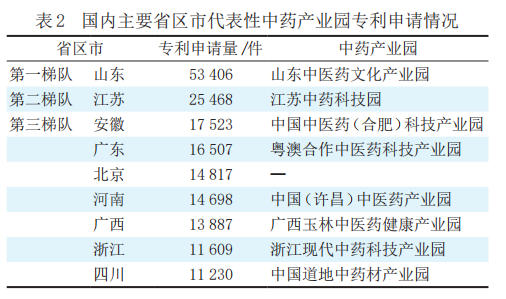 中药领域:国内主要省区市中药专利技术的布局存在差异(表2)。中药组合物和配方为布局热点,已形成专利高地,山东表现最为突出,其次是广西、广东、江苏、河南。在中药提取、分离、干燥方面,安徽表现最为突出;在剂型和应用方面,山东、安徽、广东表现较为突出(表3)。