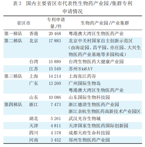 国内医药及医疗器械领域专利主要分布在长三角、珠三角、环渤海等经济发达地带。此外,河南、四川、安徽、湖北等中部省市区域表现也较为突出。在化学药、中药、生物药、医疗器械四大细分技术领域,各省区市热点技术领域的专利布局各具特色。各省区市专利布局热点的优势地位离不开园区集群优势的支撑。园区建设为控制成本、加剧行业竞争、刺激创新、开展合作创造了条件,增强了区域竞争力。其中,中药领域以粤澳合作中医药科技产业园、广西玉林中医药健康产业园、山东中医药文化产业园等为代表。生物药领域和医疗器械领域在国内主要省区市建立了特色产业园及产业集群,代表性生物药产业园区主要有北京中关村国家自主创新示范区、上海张江药谷、苏州BioBAY、武汉光谷生物城、广州国际生物岛和成都天府生命科技园[7]。相较而言,全球生物医药产业以高校高密度聚集为源头,形成产业园区集群模式发展及“四位一体”的要素集聚格局。例如,波士顿基因城、圣地亚哥生命科技园、旧金山生命科技湾、华盛顿制药城以及北卡罗来纳研究三角园等生物医药产业园区周边汇集了美国近一半的生物医药优势领域高校,如哈佛大学、麻省理工大学等,带动美国生物医药实现跨越发展,使其成为全球现代生物技术创新发展的策源地。因此,国内医药及医疗器械领域在充分发挥集群优势的基础上,可进一步强化国内高校的源头辐射作用,实现更好的整体联动效应。