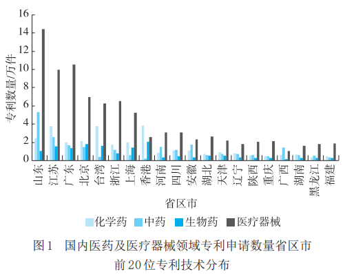 国内医药及医疗器械领域专利申请数量前20位的省区市,在化学药、中药、生物药、医疗器械四大细分技术领域的专利分布有所差异(图1)。