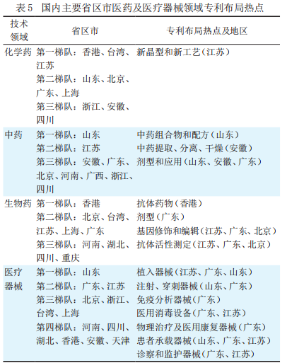 医药及医疗器械领域,国内专利主要分布在长三角、珠三角、环渤海等经济发达地带。此外,河南、四川、安徽、湖北等中部省区市表现也较为突出。在化学药、中药、生物药、医疗器械四大细分技术领域,各省区市在布局热点技术领域的专利布局各具特色。见表5。