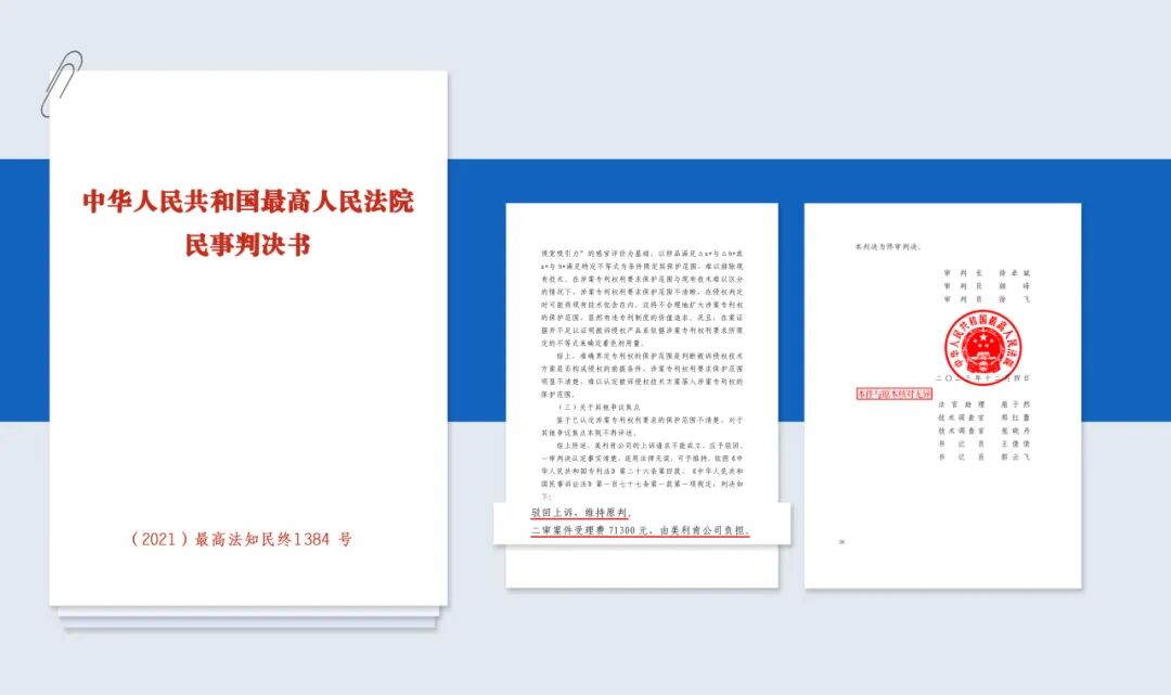美利肯公司不服提起上诉,中华人民共和国最高人民法院于2021年11月12日公开开庭进行审理,认为涉案专利权利要求保护范围明显不清楚,难以认定,遂驳回上诉,维持原判。