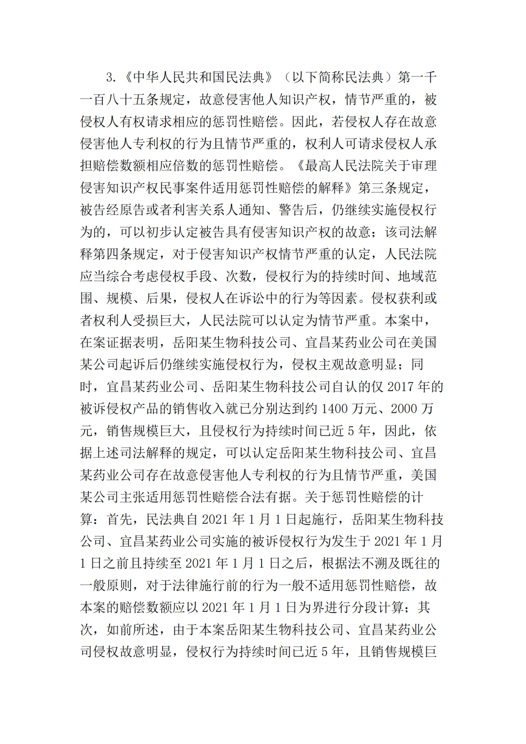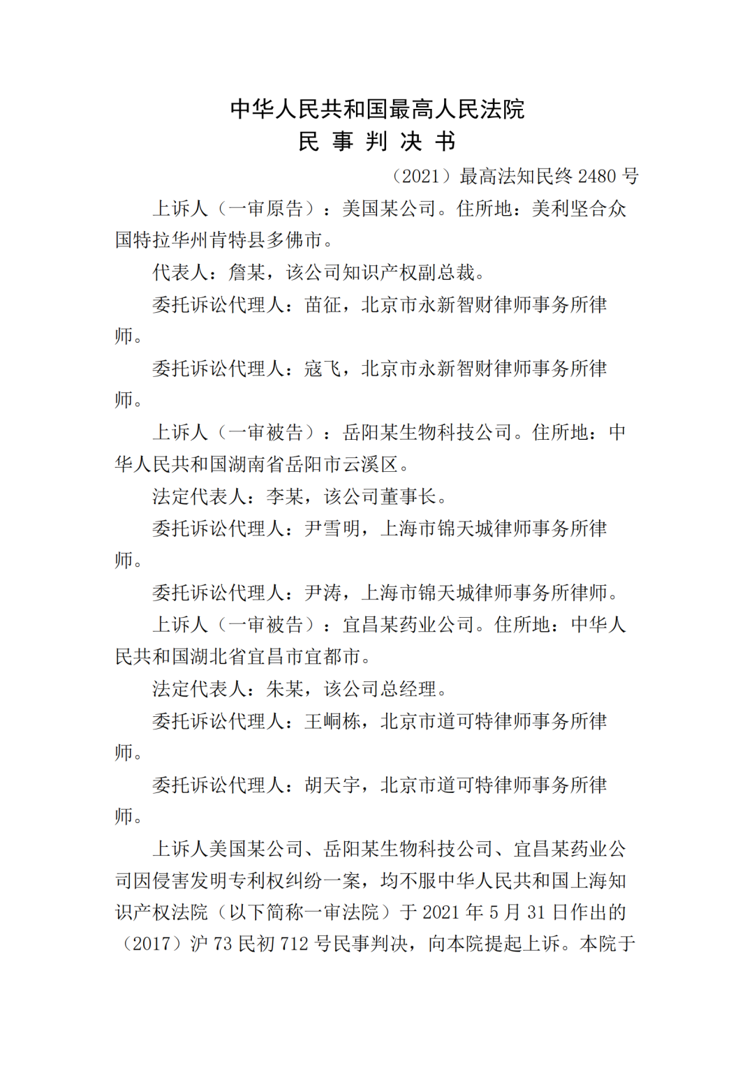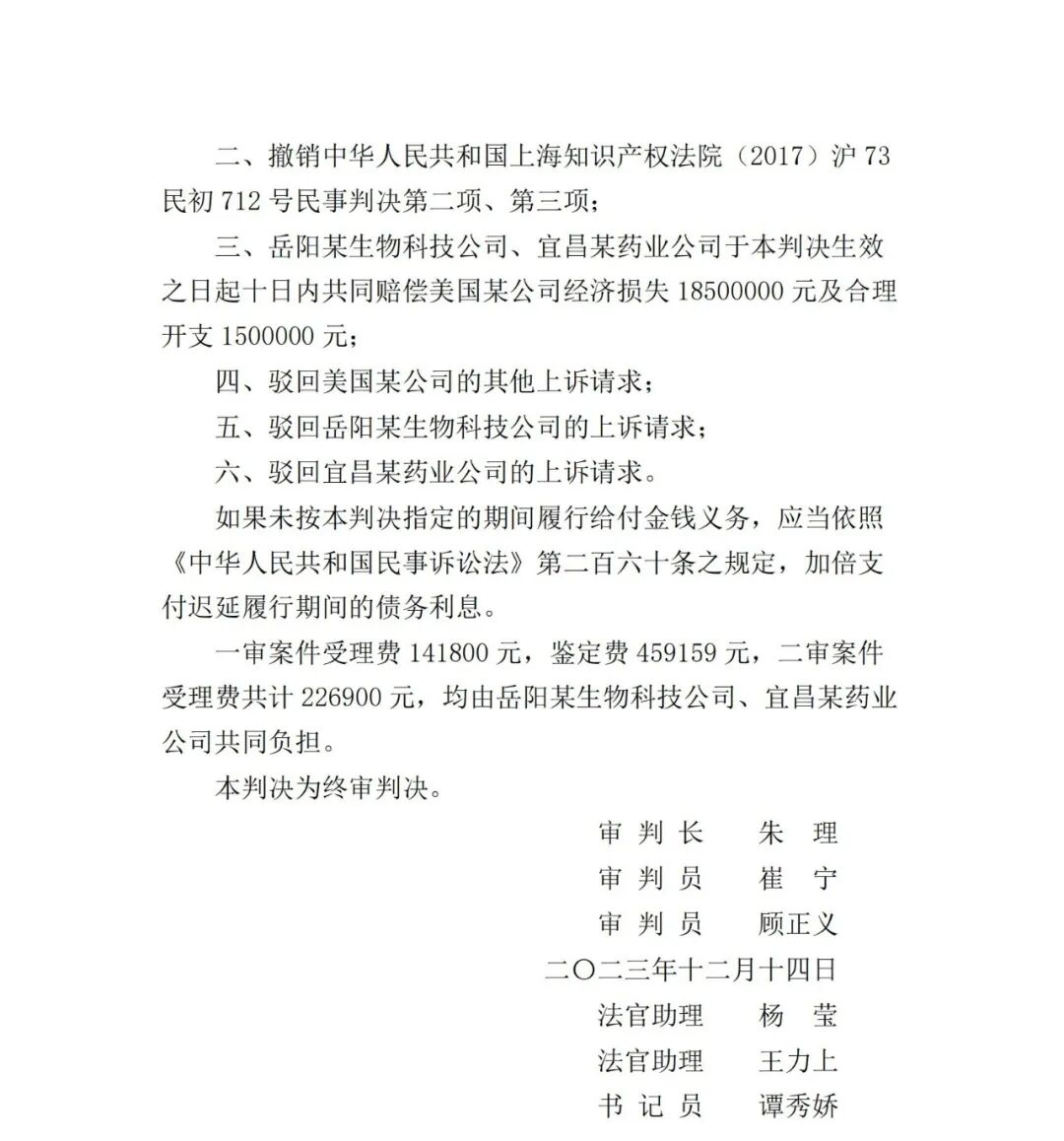 2024年2月22日,中国裁判文书网更新“美国某公司、岳阳某生物科技公司等侵害发明专利权纠纷民事二审民事判决书”。判决书显示,最高人民法院在2023年对该案做出终审判决,判赔金额2000万元。