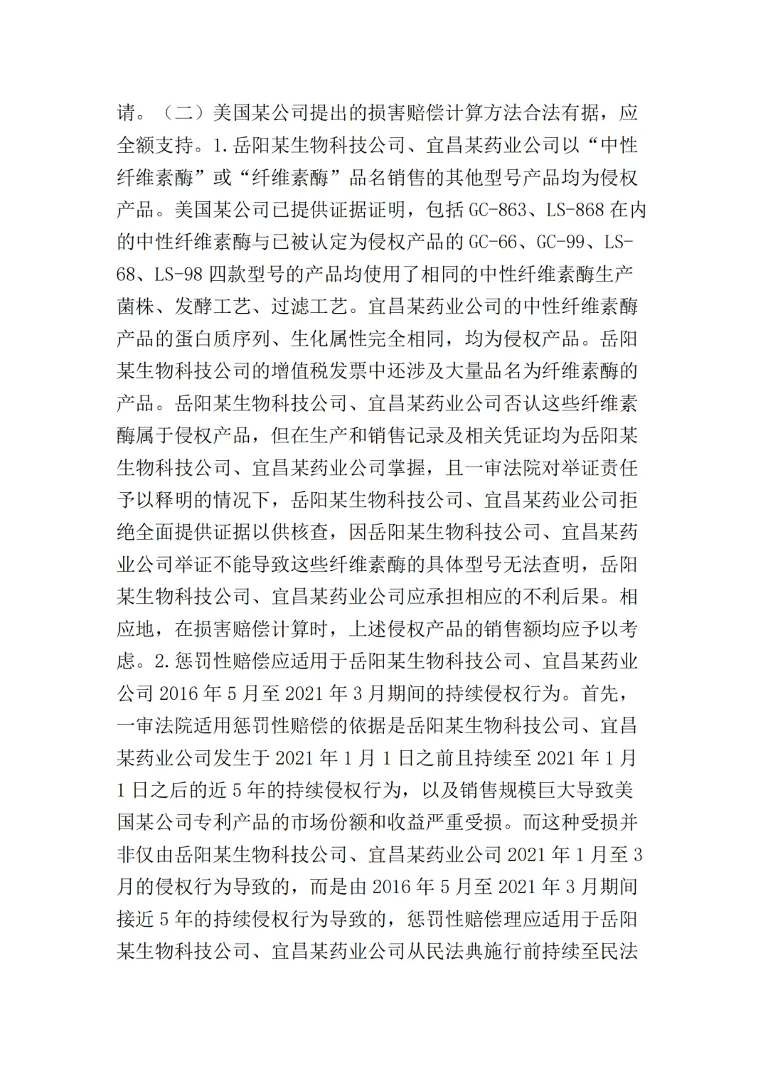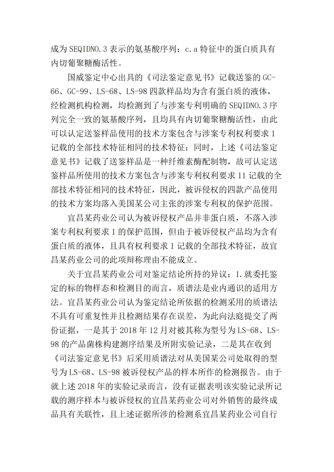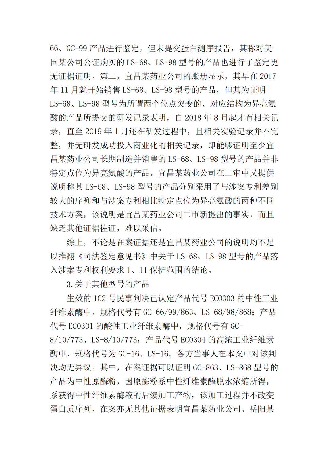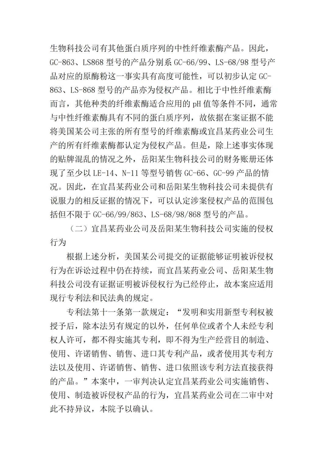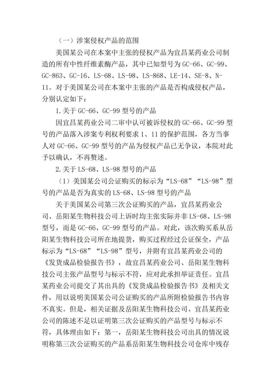 在二审中,法院认为依据在案证据,不能将美国某公司主张的所有型号的纤维素酶或宜昌某药业公司生产的所有纤维素酶都认定为侵权产品,但可以认定涉案侵权产品的范围包括但不限于GC-66/99/863、LS-68/98/868型号的产品。
