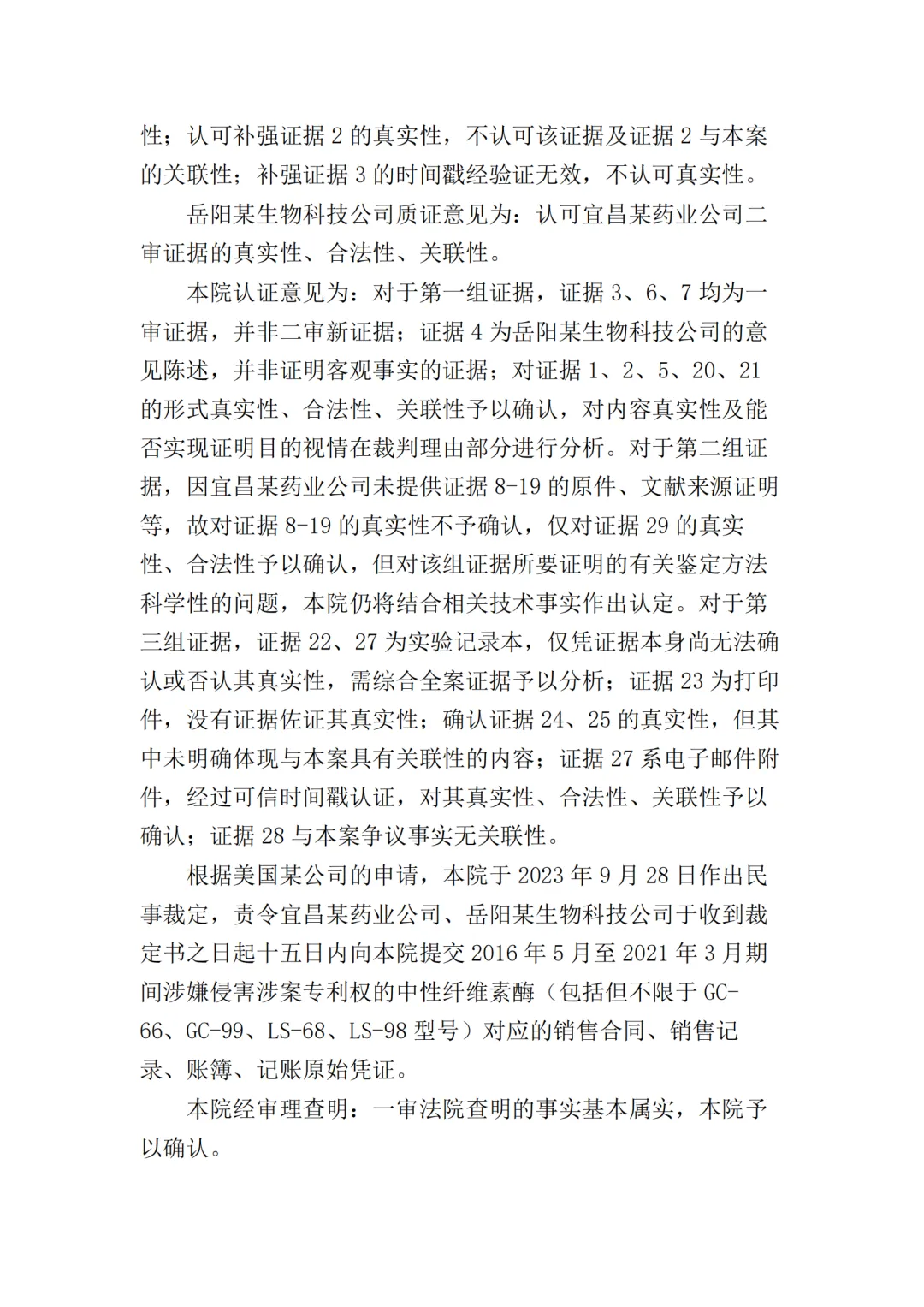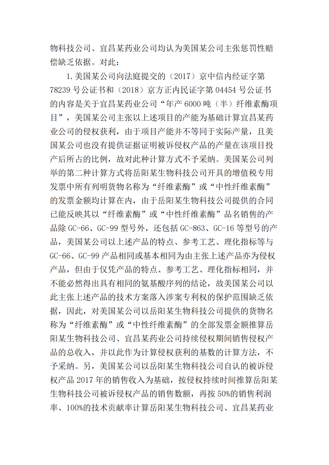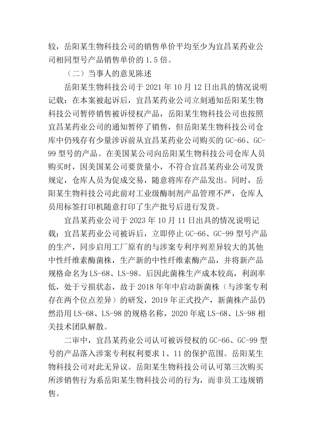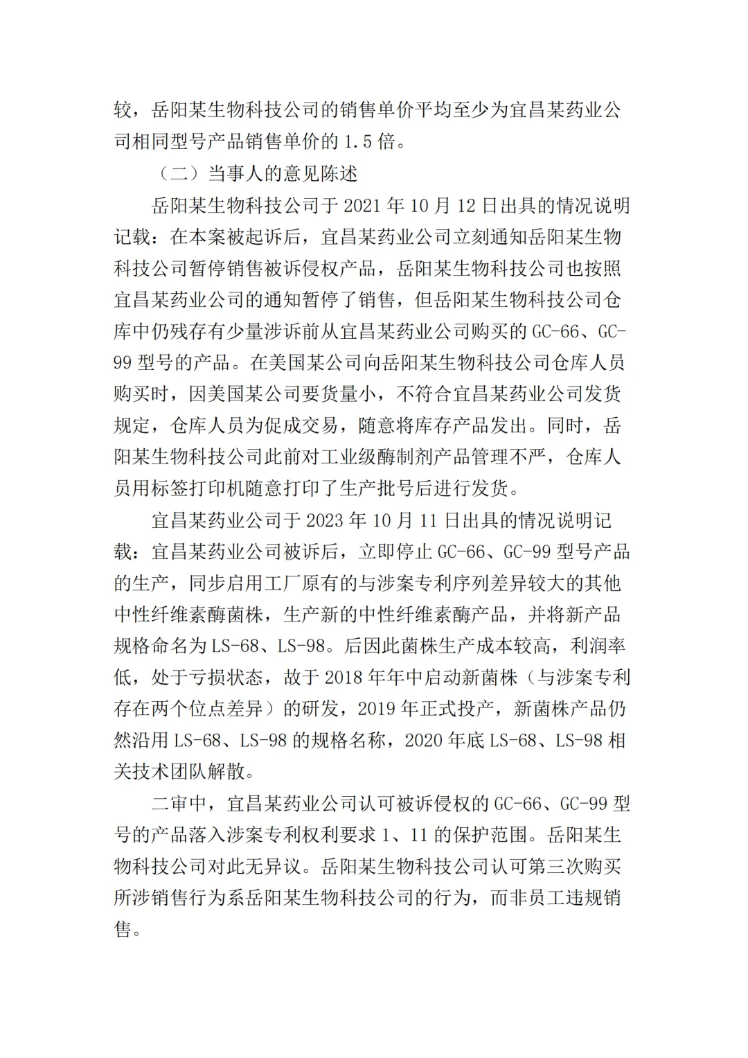 在二审中,法院认为依据在案证据,不能将美国某公司主张的所有型号的纤维素酶或宜昌某药业公司生产的所有纤维素酶都认定为侵权产品,但可以认定涉案侵权产品的范围包括但不限于GC-66/99/863、LS-68/98/868型号的产品。