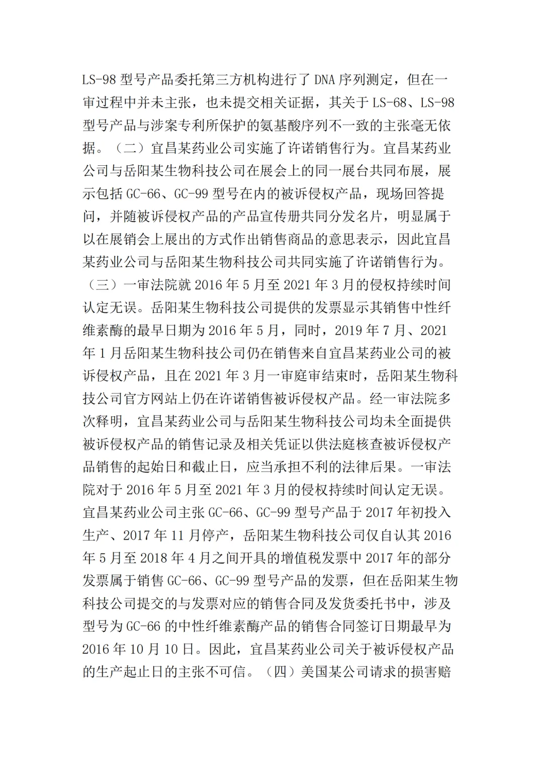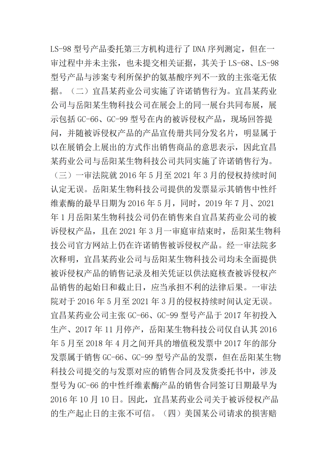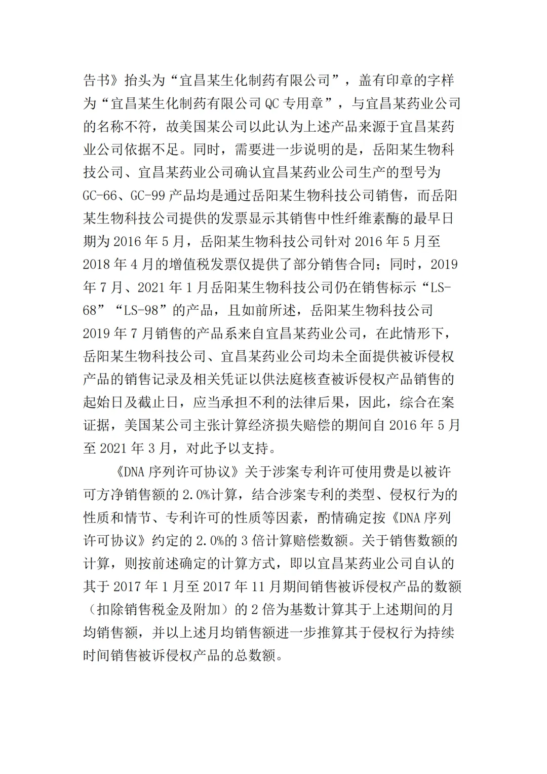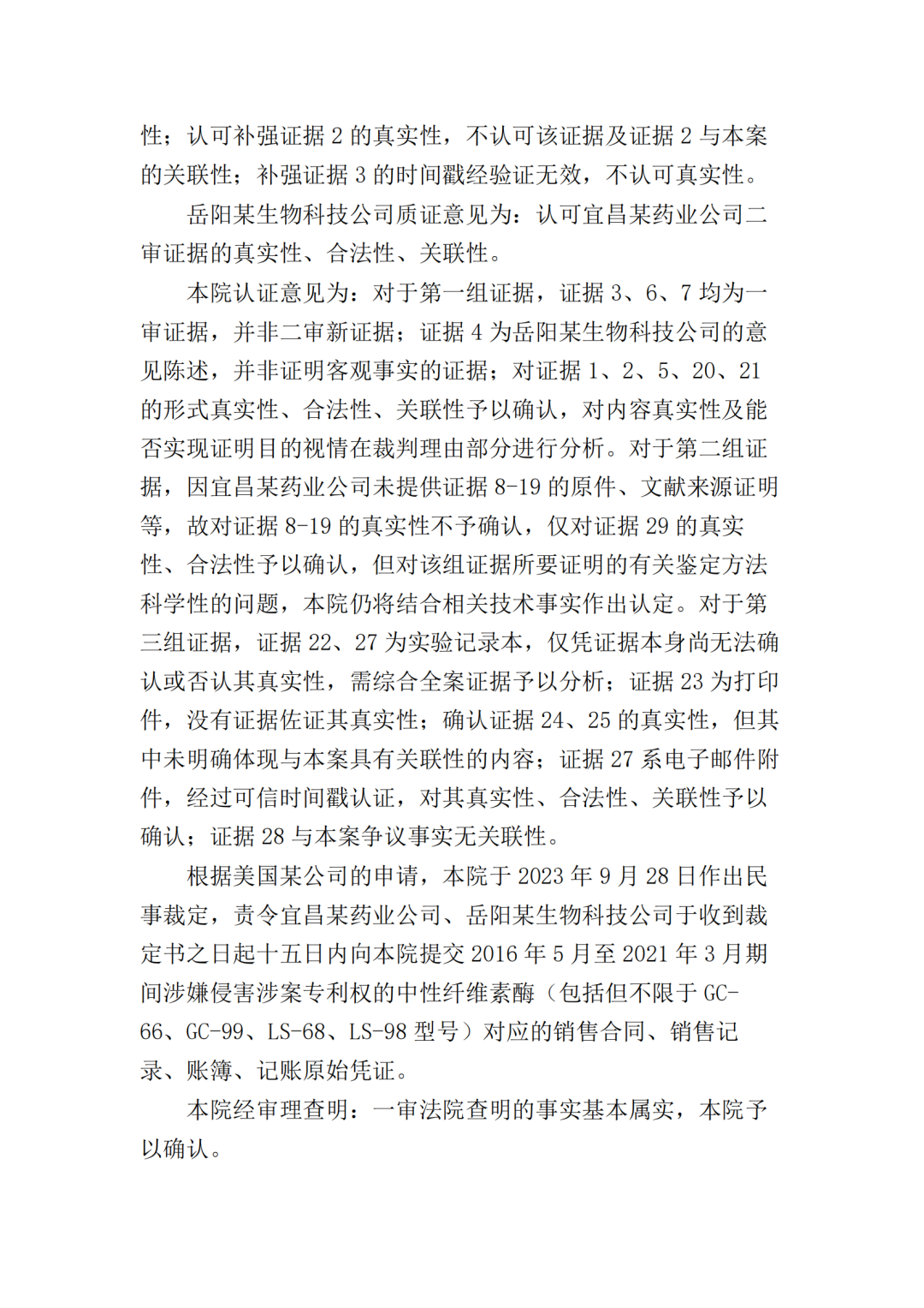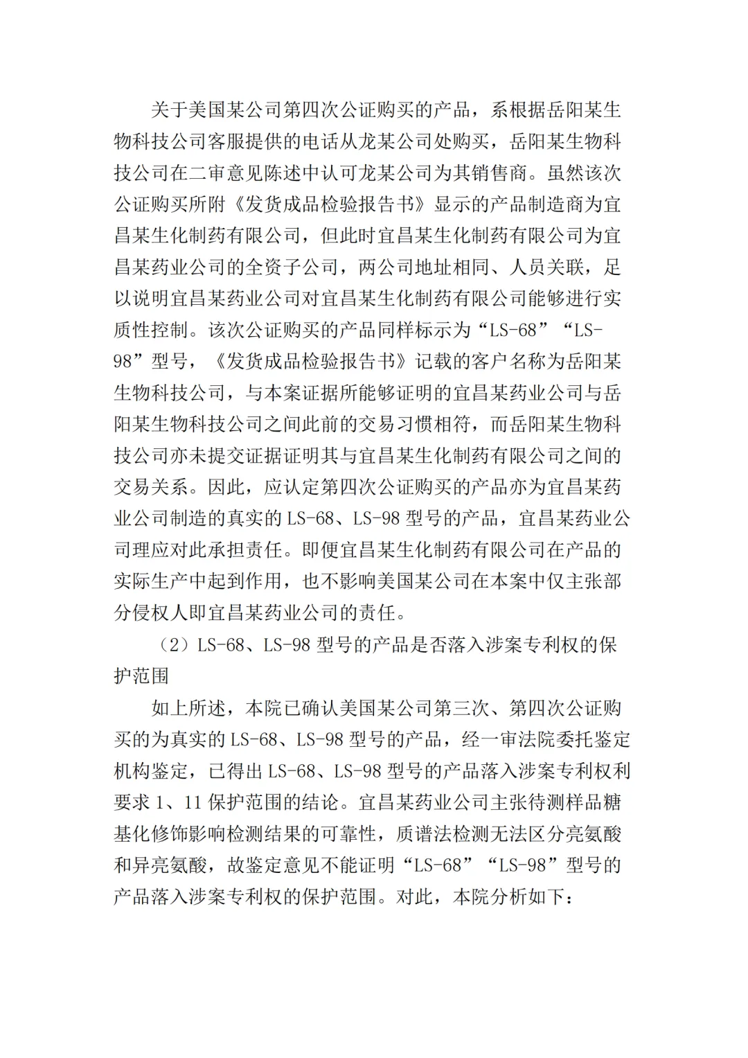 在二审中,法院认为依据在案证据,不能将美国某公司主张的所有型号的纤维素酶或宜昌某药业公司生产的所有纤维素酶都认定为侵权产品,但可以认定涉案侵权产品的范围包括但不限于GC-66/99/863、LS-68/98/868型号的产品。