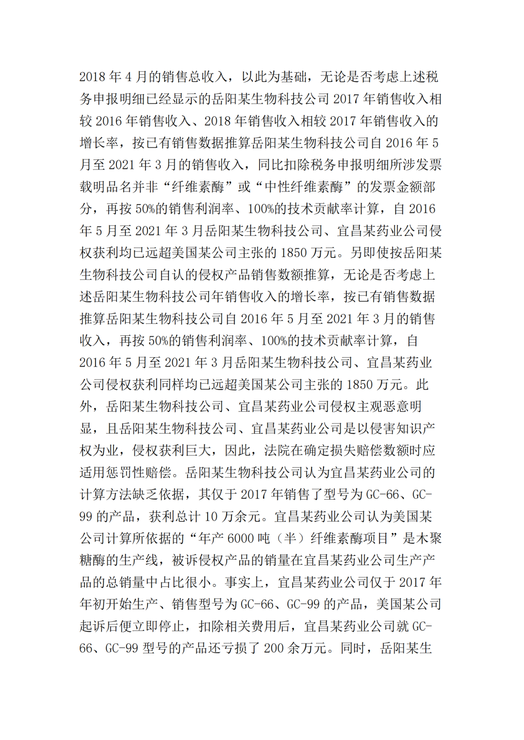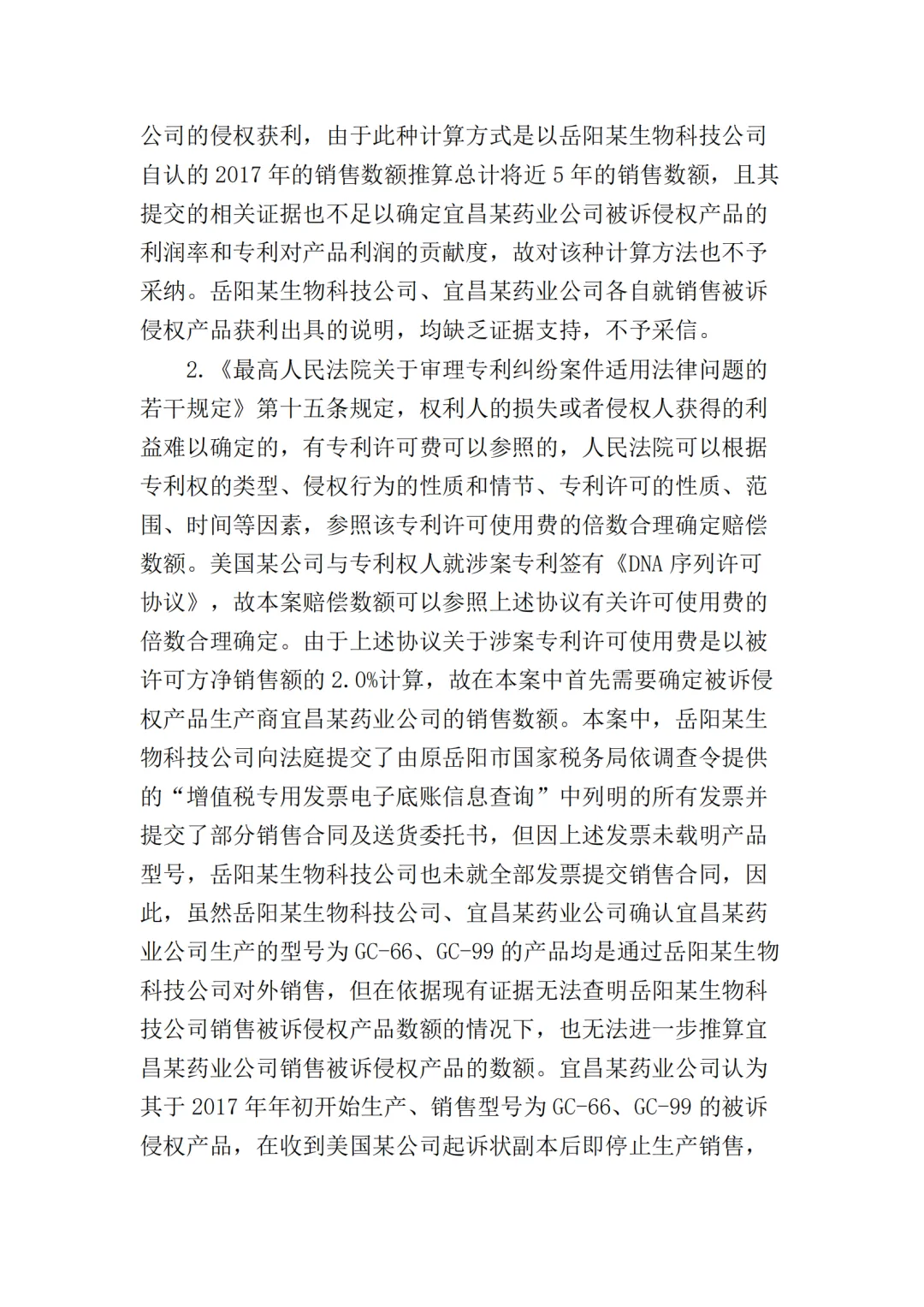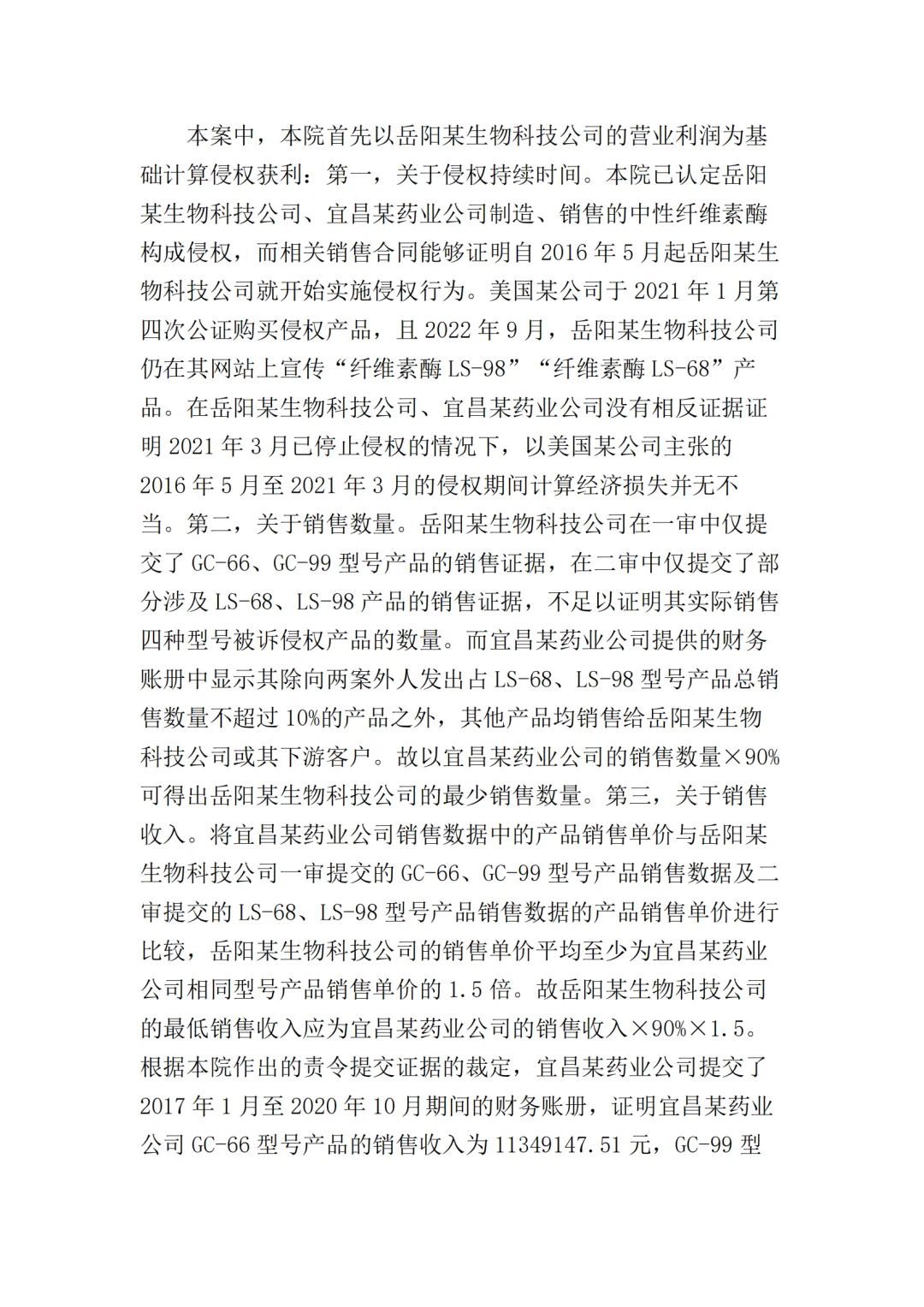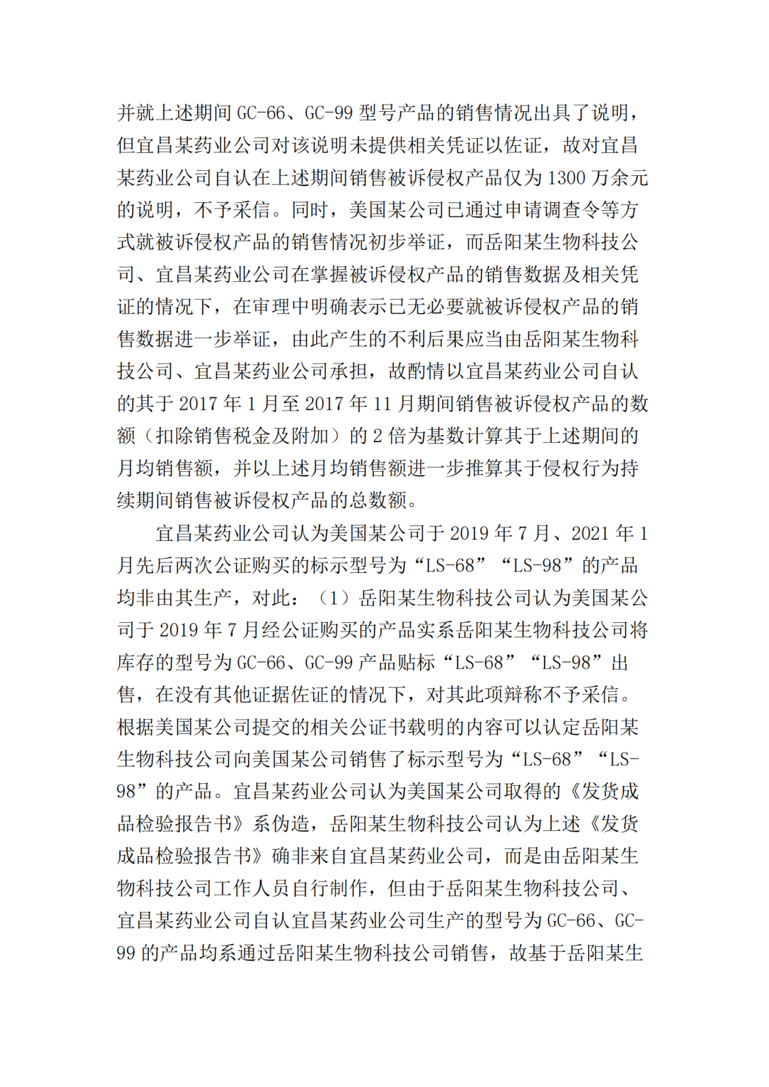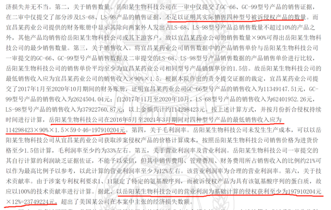 此外,最高院根据宜昌某药业公司提供的部分产品型号的财务账册,认定岳阳某生物公司在2016年5月至2021年3月期间,对GC-66、GC-99、LS-68、LS-98四种型号产品的最低销售收入应为197910204元(约2亿),侵权获利至少23749224元(约2375万),超出了美国某公司在本案中主张的经济损失数额。