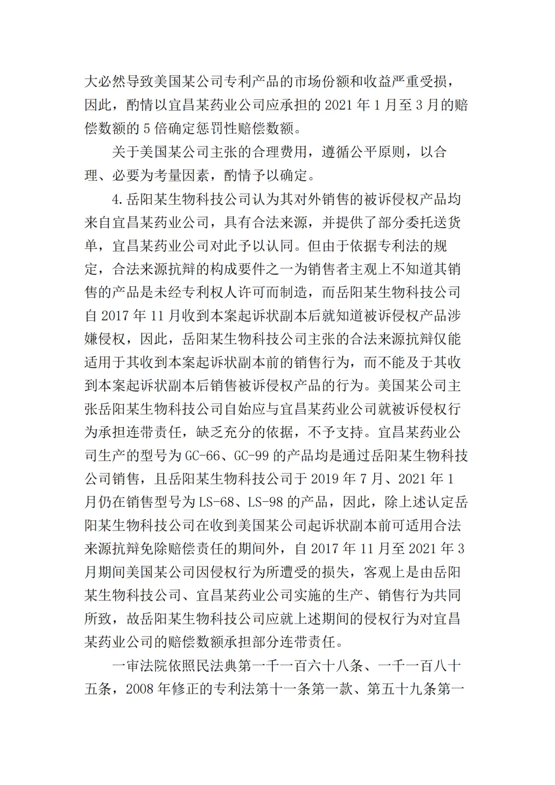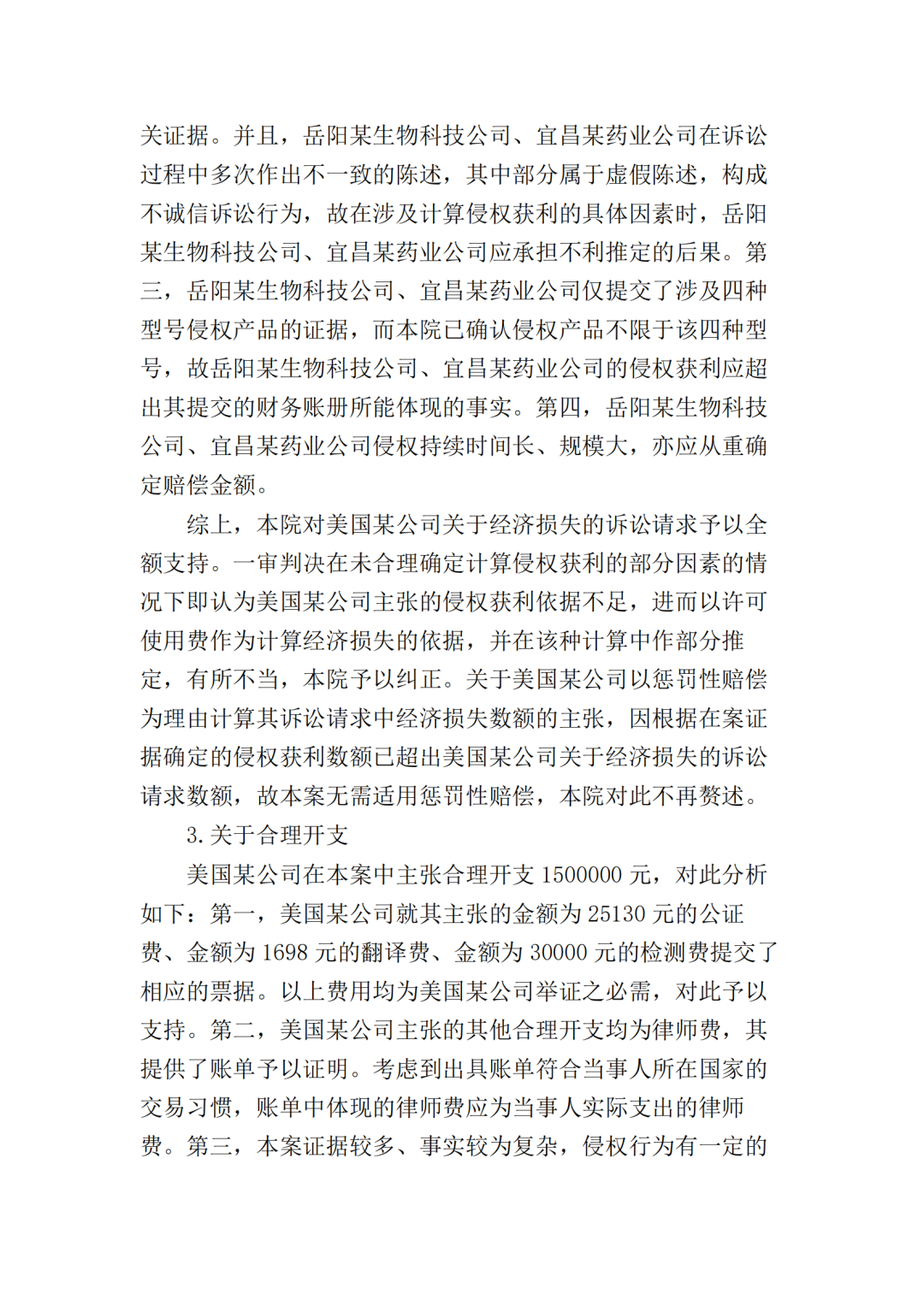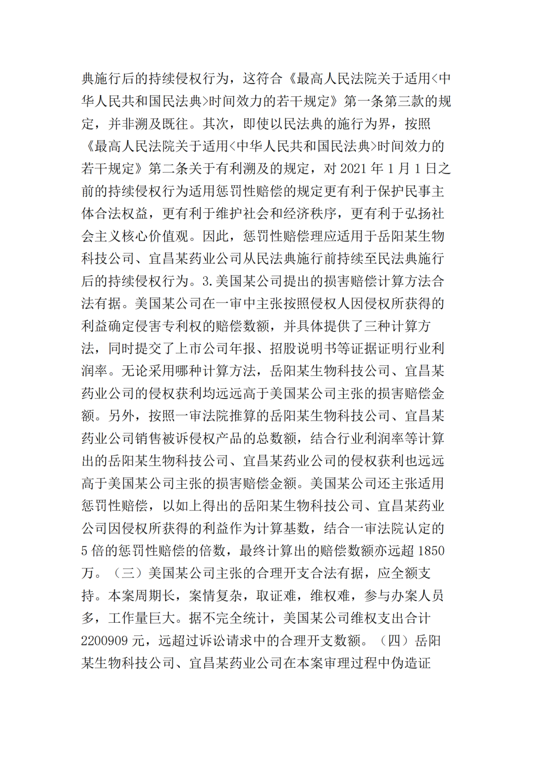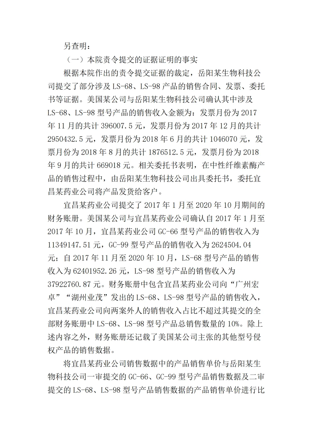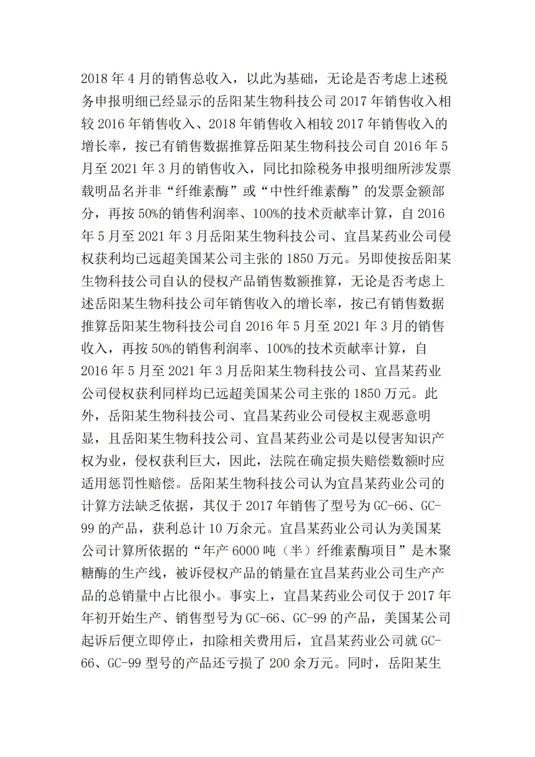 此外,最高院根据宜昌某药业公司提供的部分产品型号的财务账册,认定岳阳某生物公司在2016年5月至2021年3月期间,对GC-66、GC-99、LS-68、LS-98四种型号产品的最低销售收入应为197910204元(约2亿),侵权获利至少23749224元(约2375万),超出了美国某公司在本案中主张的经济损失数额。