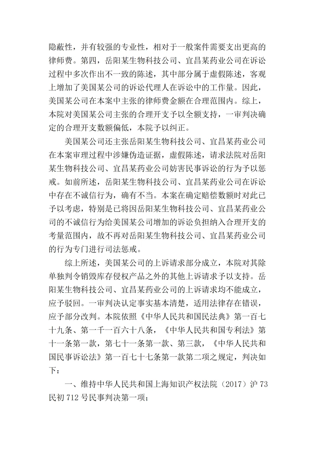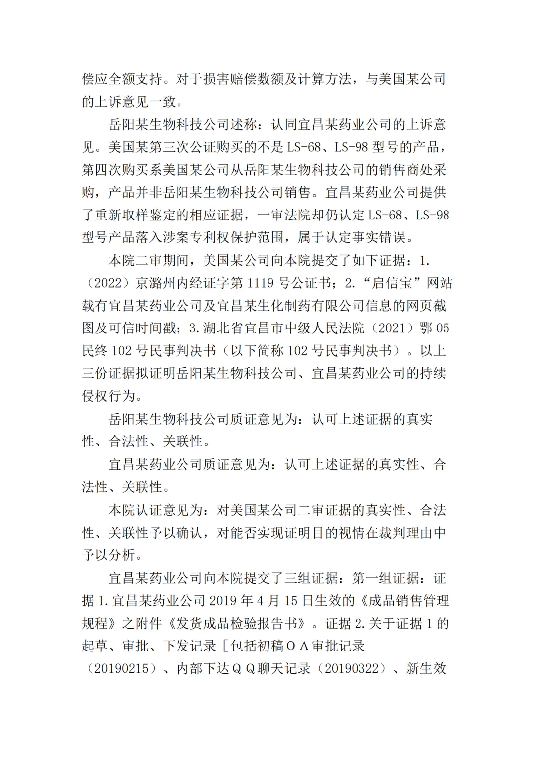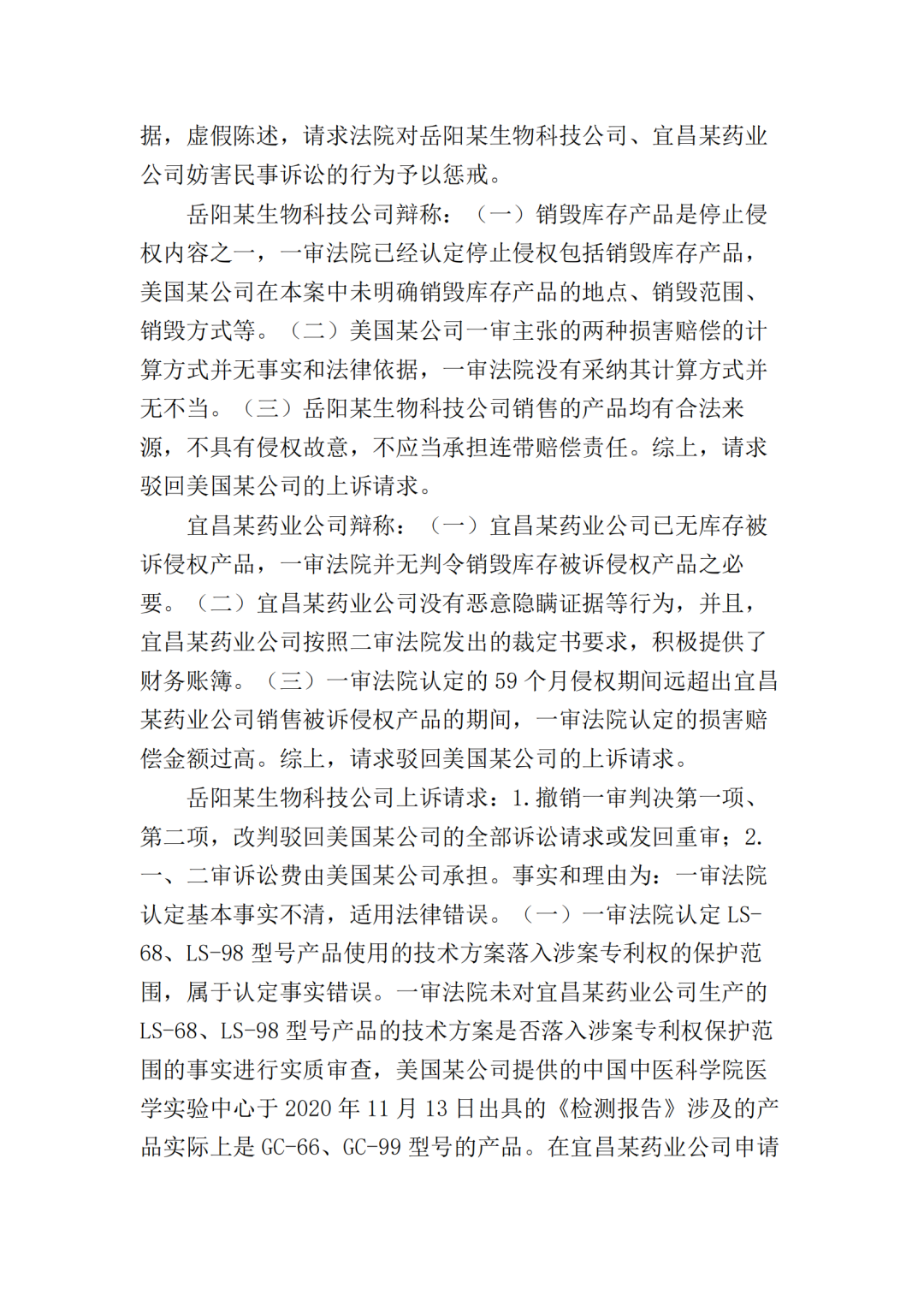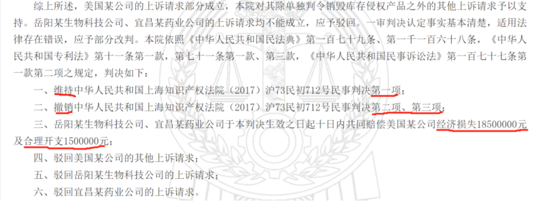 随后,原被告双方均不服一审判决向最高院提起上诉。原告美国某公司的上诉请求主要为二被告销毁库存的侵权产品,及改判二被告共同赔偿原告经济损失、维权合理开支合计2000万元。被告岳阳某生物公司上诉请求为撤销一审判决第一项、第二项,改判驳回美国某公司的全部诉讼请求或发回重审;一、二审诉讼费由美国某公司承担。被告宜昌某药业公司上诉请求为撤销一审判决,并依法改判。