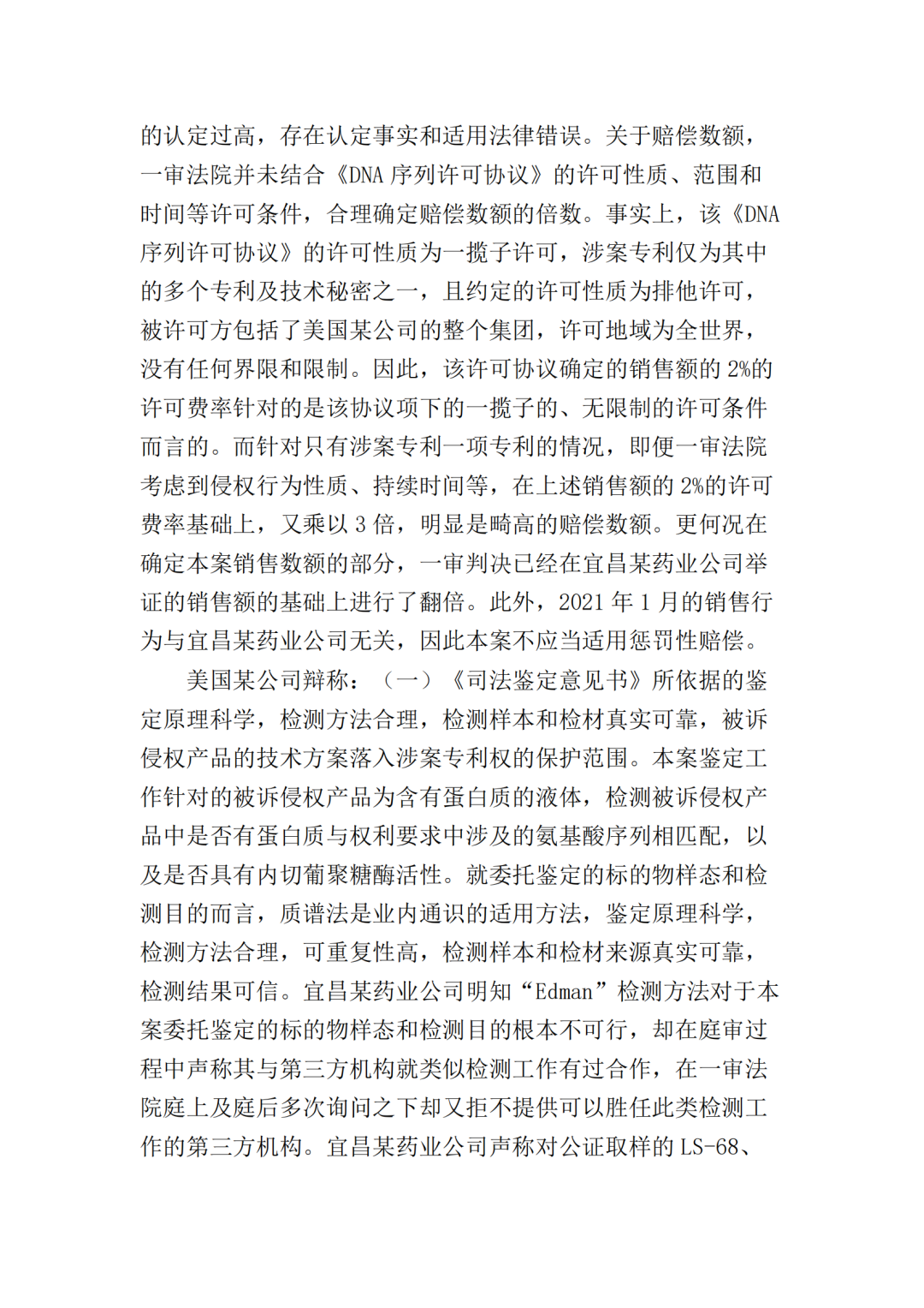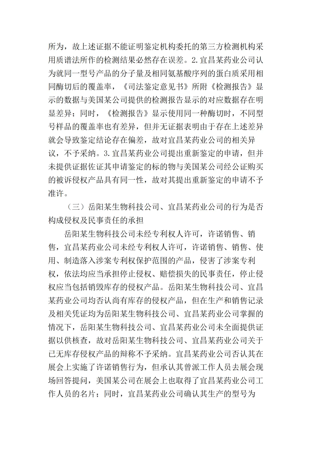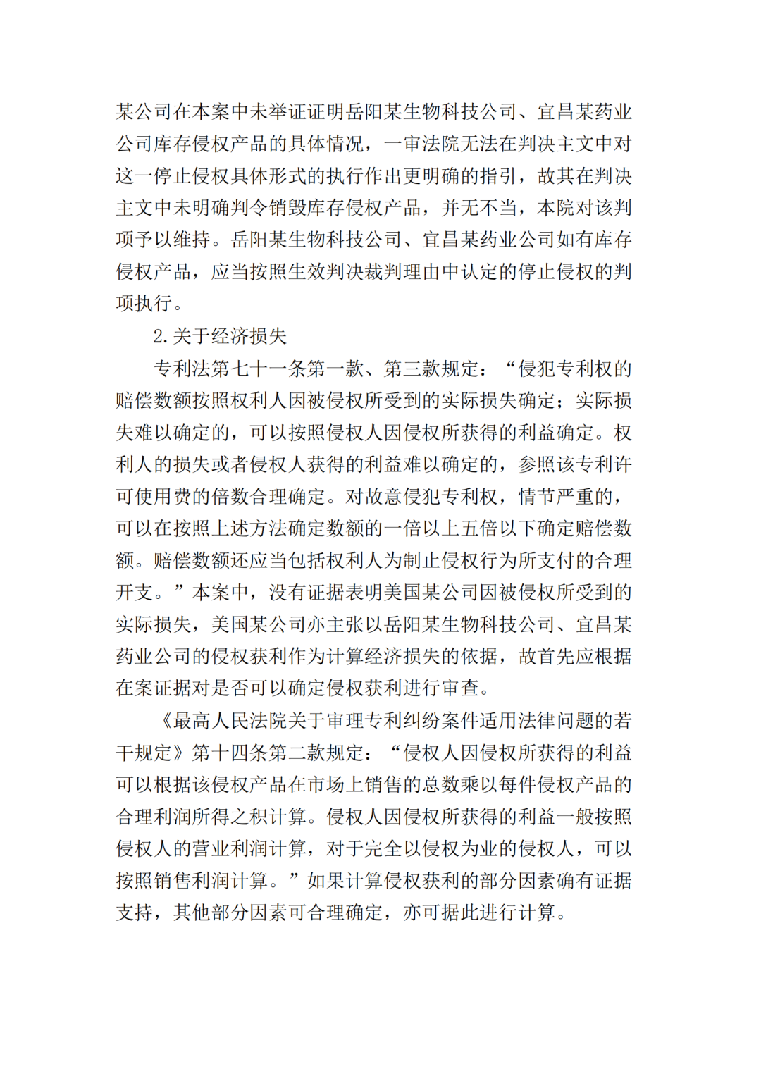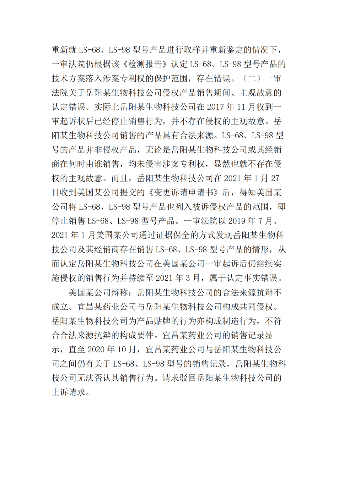 随后,原被告双方均不服一审判决向最高院提起上诉。原告美国某公司的上诉请求主要为二被告销毁库存的侵权产品,及改判二被告共同赔偿原告经济损失、维权合理开支合计2000万元。被告岳阳某生物公司上诉请求为撤销一审判决第一项、第二项,改判驳回美国某公司的全部诉讼请求或发回重审;一、二审诉讼费由美国某公司承担。被告宜昌某药业公司上诉请求为撤销一审判决,并依法改判。