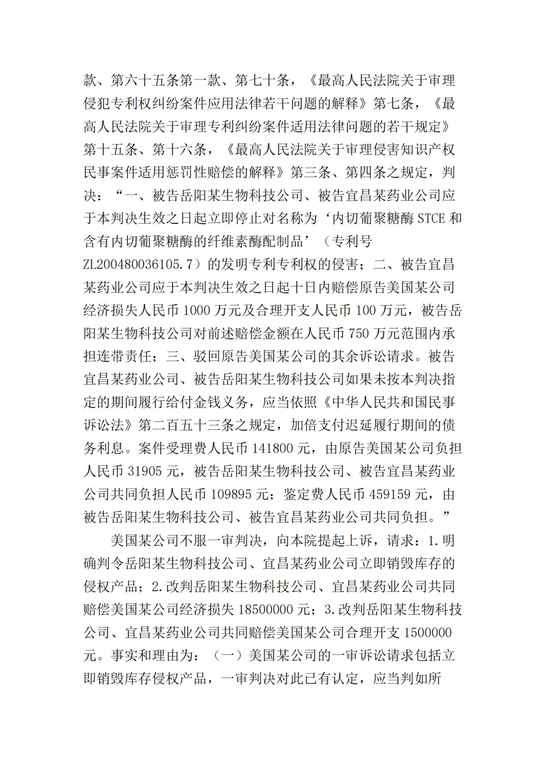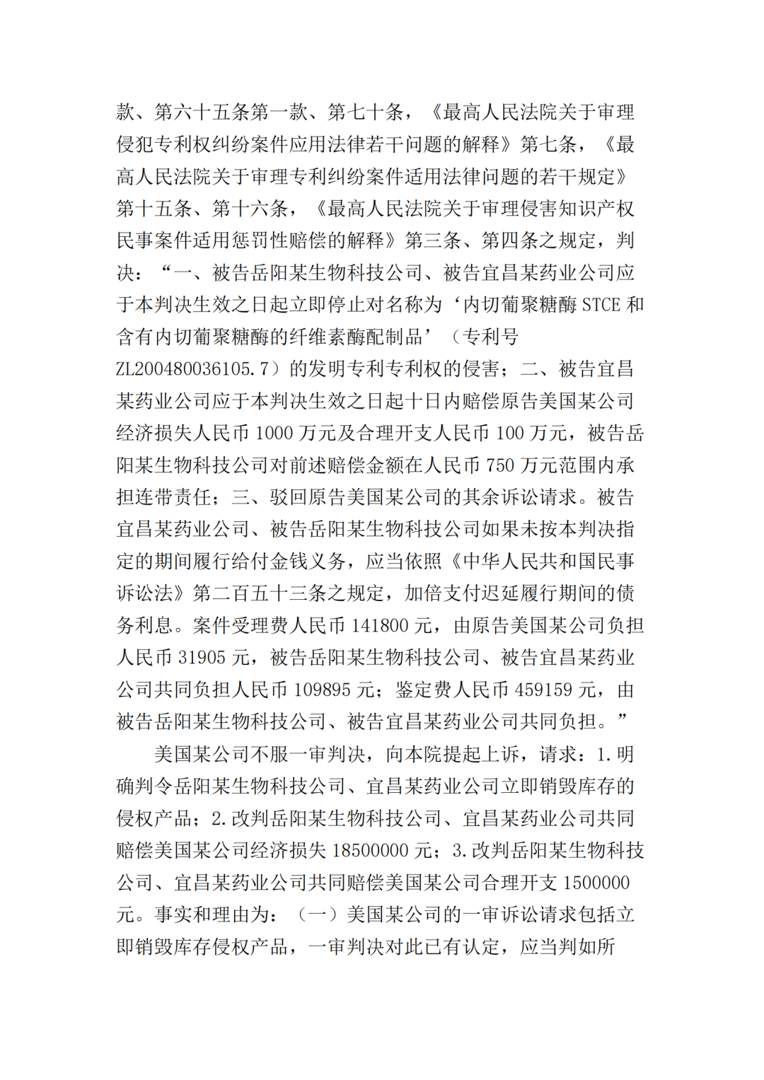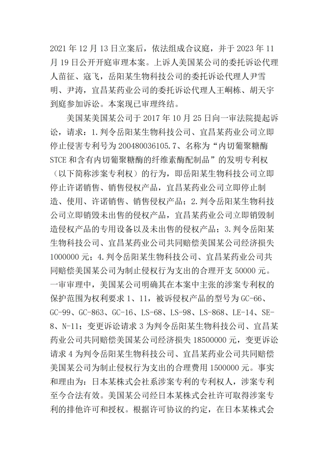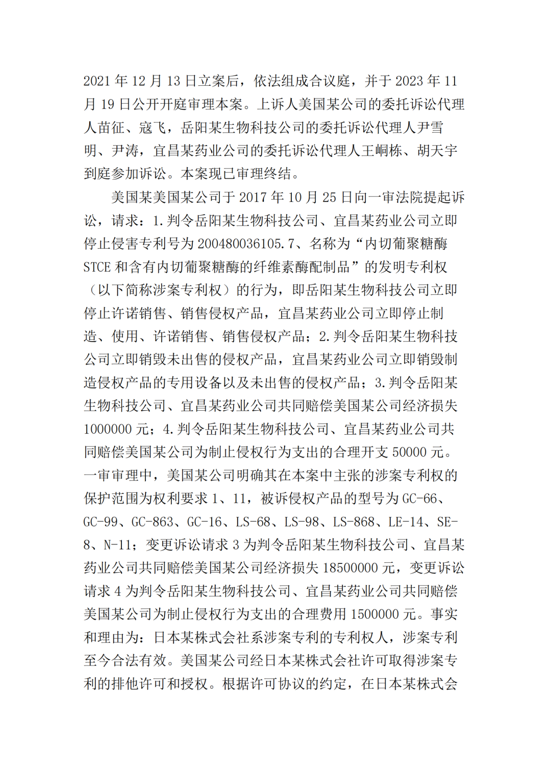 2017年10月25日,美国某公司在上海知识产权法院(下称“一审法院”)发起专利侵权诉讼,指控岳阳某生物科技公司(以下简称“岳阳某生物公司”)、宜昌某药业公司侵犯其第200480036105.7号名称为“内切葡聚糖酶STCE和含有内切葡聚糖酶的纤维素酶配制品”的发明专利,美国某公司请求法院判令: