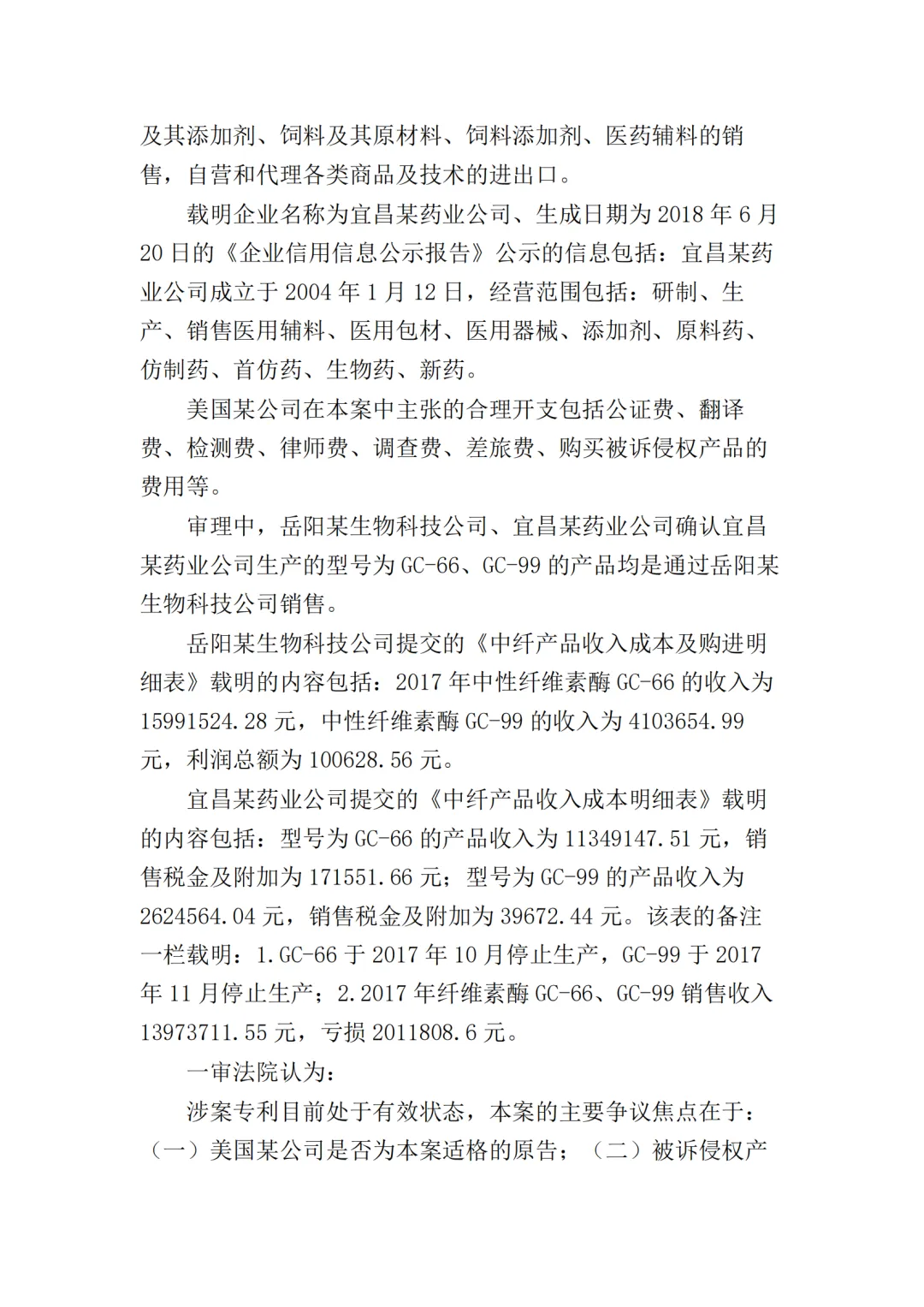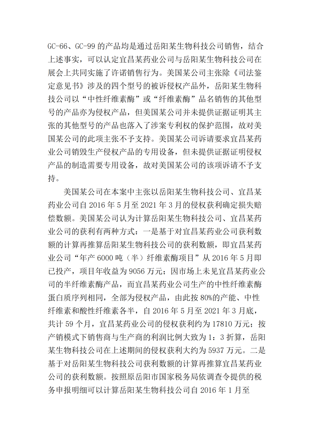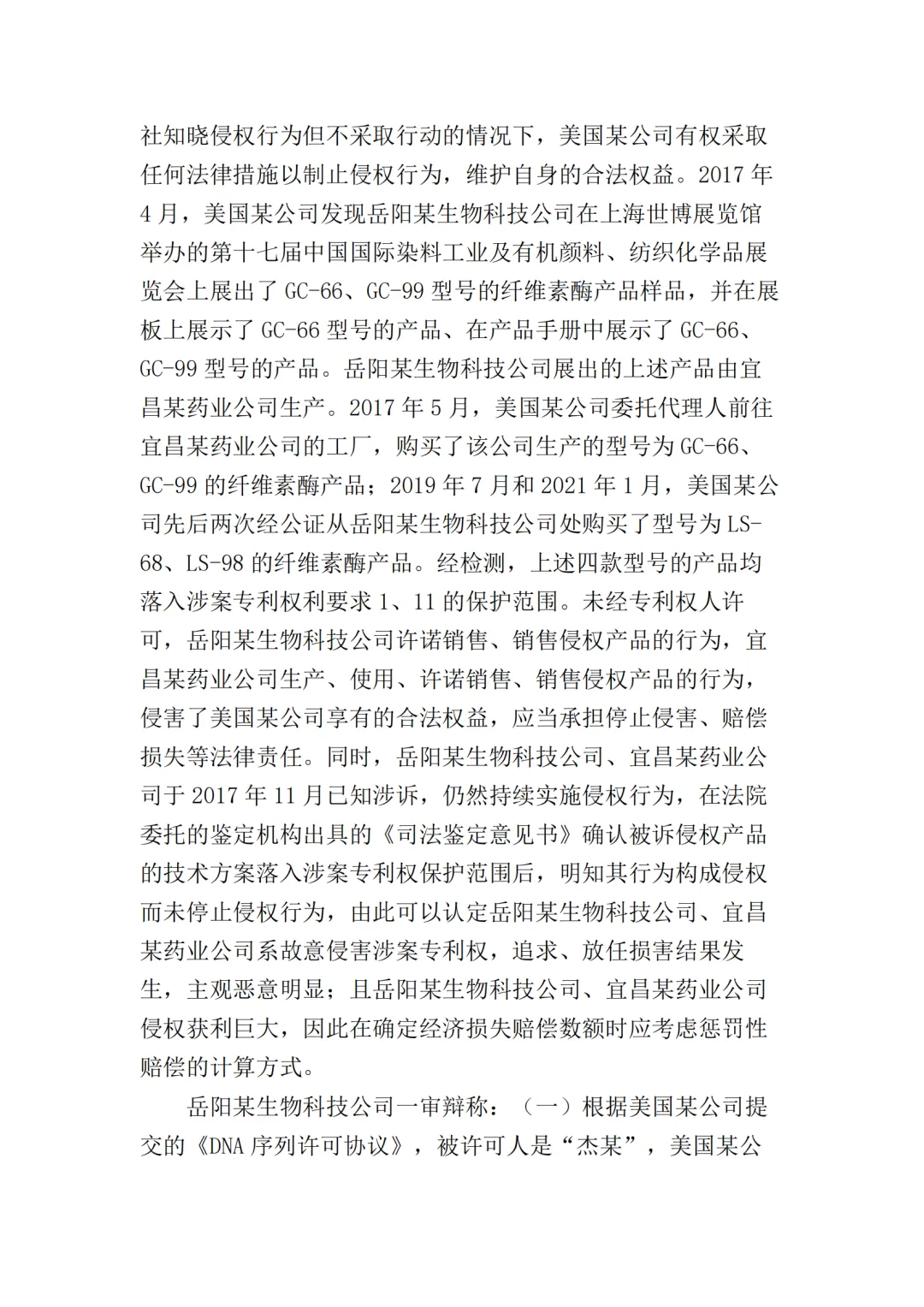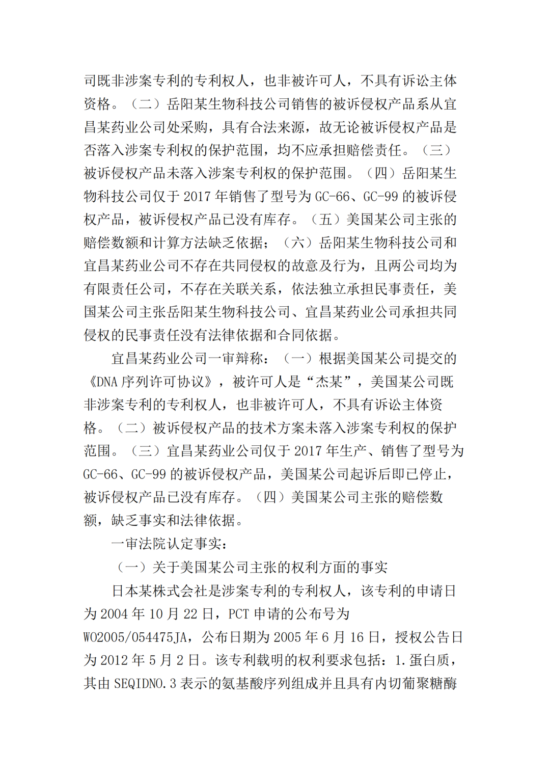 2017年10月25日,美国某公司在上海知识产权法院(下称“一审法院”)发起专利侵权诉讼,指控岳阳某生物科技公司(以下简称“岳阳某生物公司”)、宜昌某药业公司侵犯其第200480036105.7号名称为“内切葡聚糖酶STCE和含有内切葡聚糖酶的纤维素酶配制品”的发明专利,美国某公司请求法院判令: