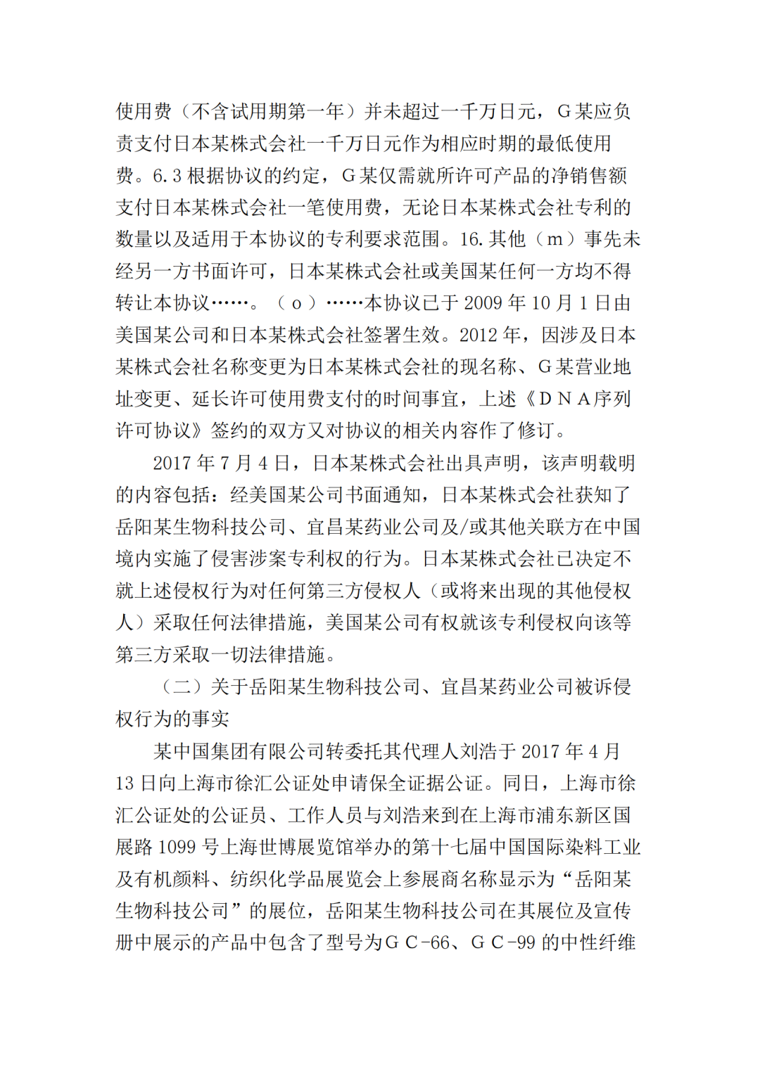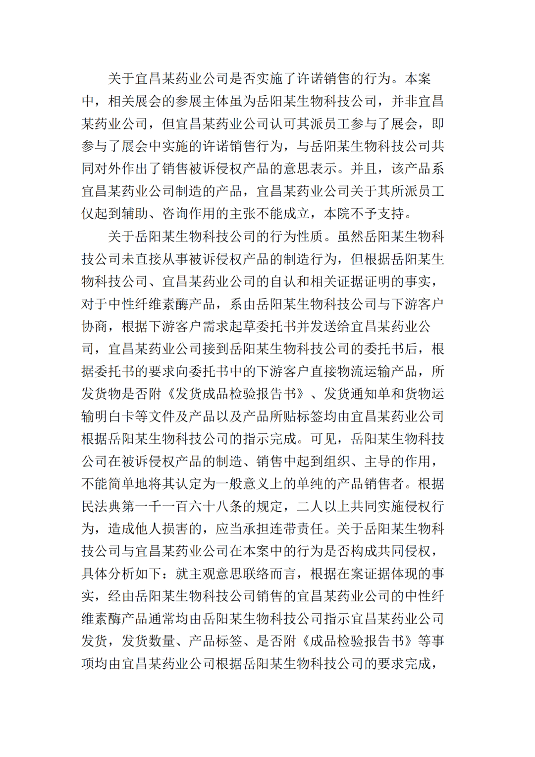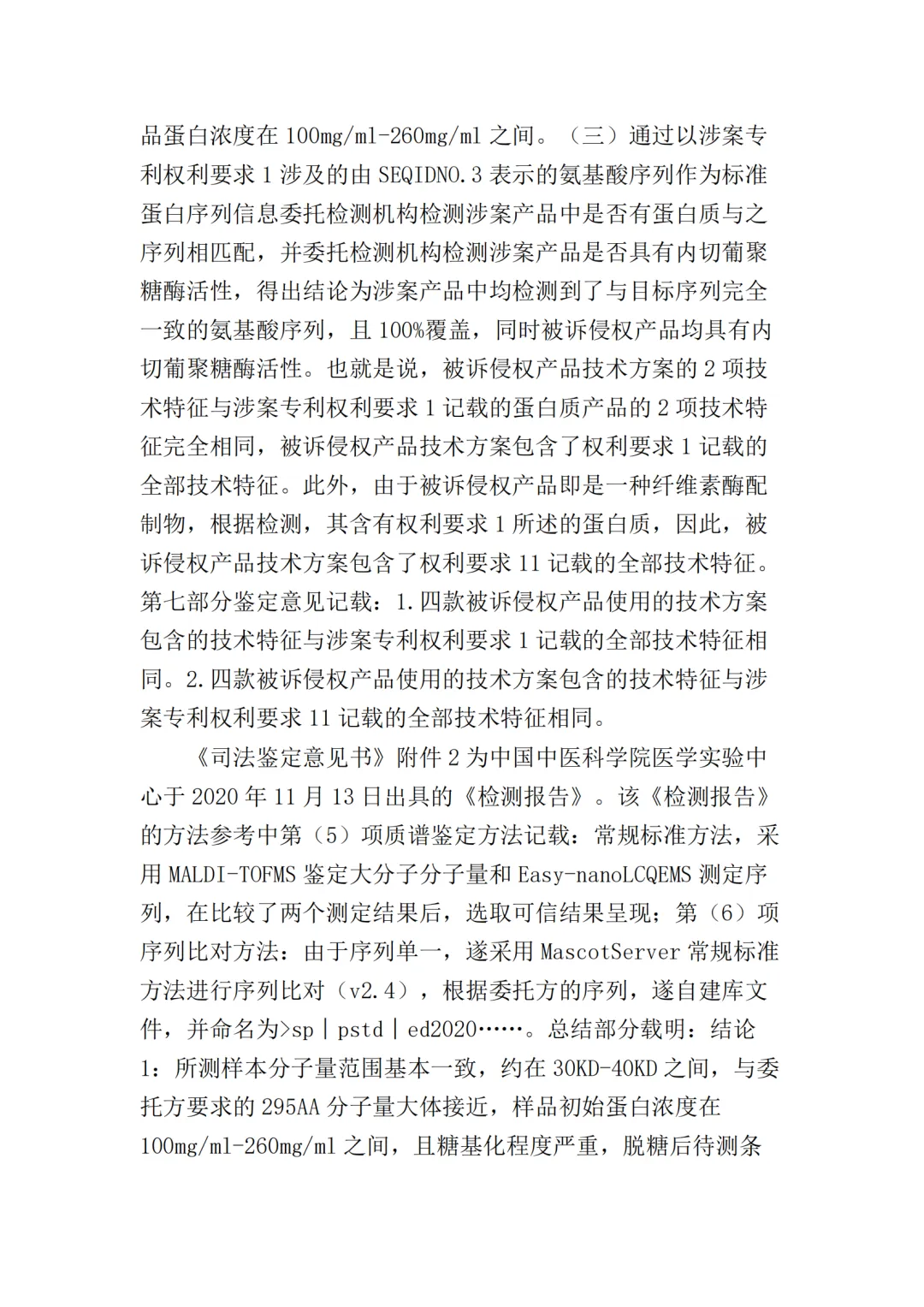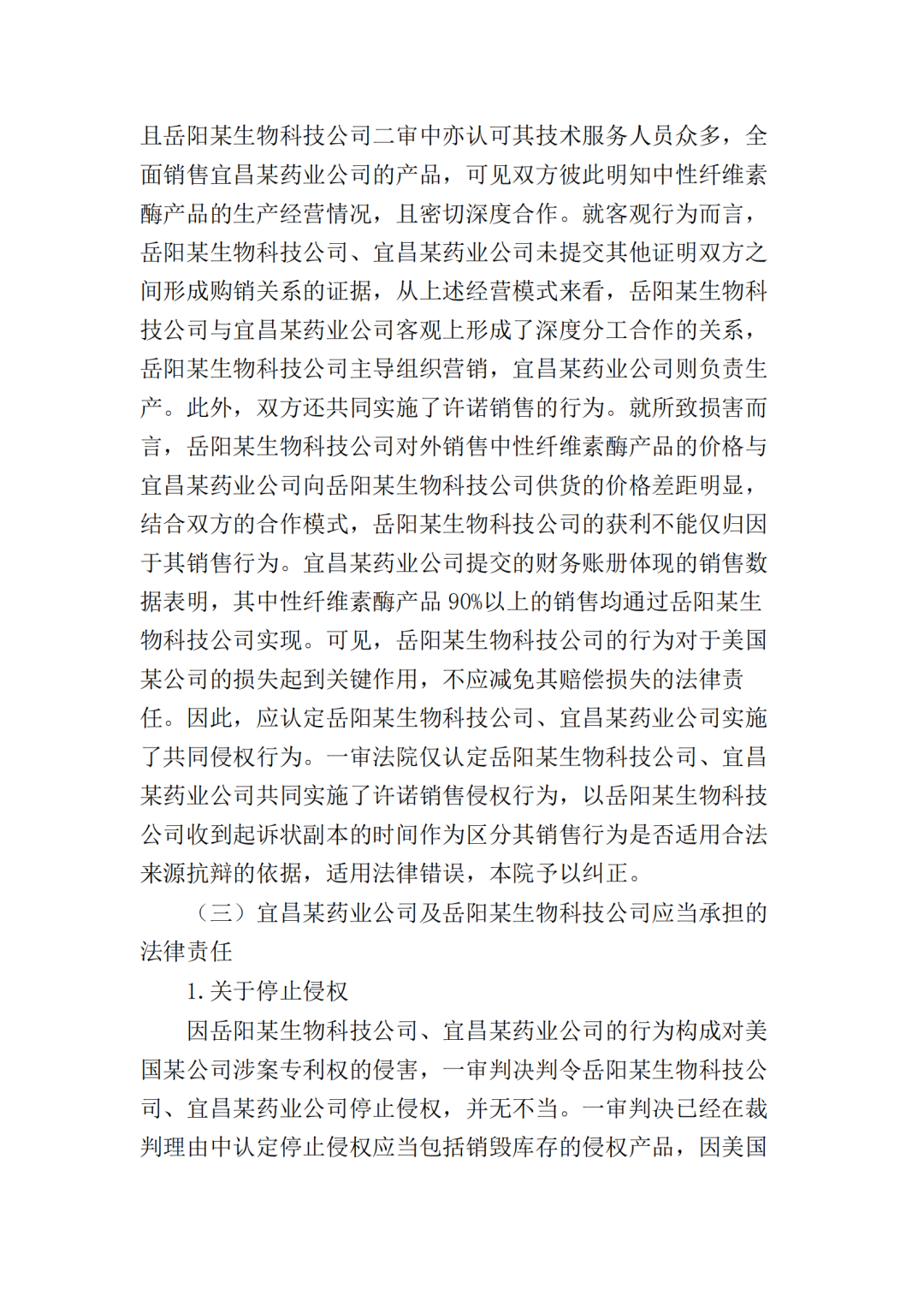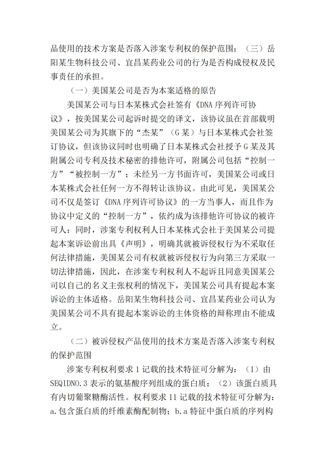 2017年10月25日,美国某公司在上海知识产权法院(下称“一审法院”)发起专利侵权诉讼,指控岳阳某生物科技公司(以下简称“岳阳某生物公司”)、宜昌某药业公司侵犯其第200480036105.7号名称为“内切葡聚糖酶STCE和含有内切葡聚糖酶的纤维素酶配制品”的发明专利,美国某公司请求法院判令: