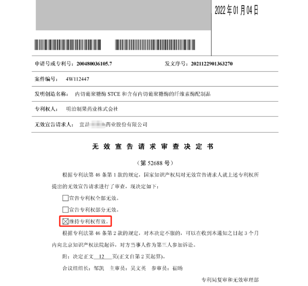 国家知识产权局查询显示,在双方诉讼爆发后,涉案专利一次被自然人程某、两次被被告宜昌某药业公司提起无效审查申请。国知局分别在2018、2021、2022年出具了关于涉案专利的无效审查决定,涉案专利在经过多轮挑战后仍旧维持有效。