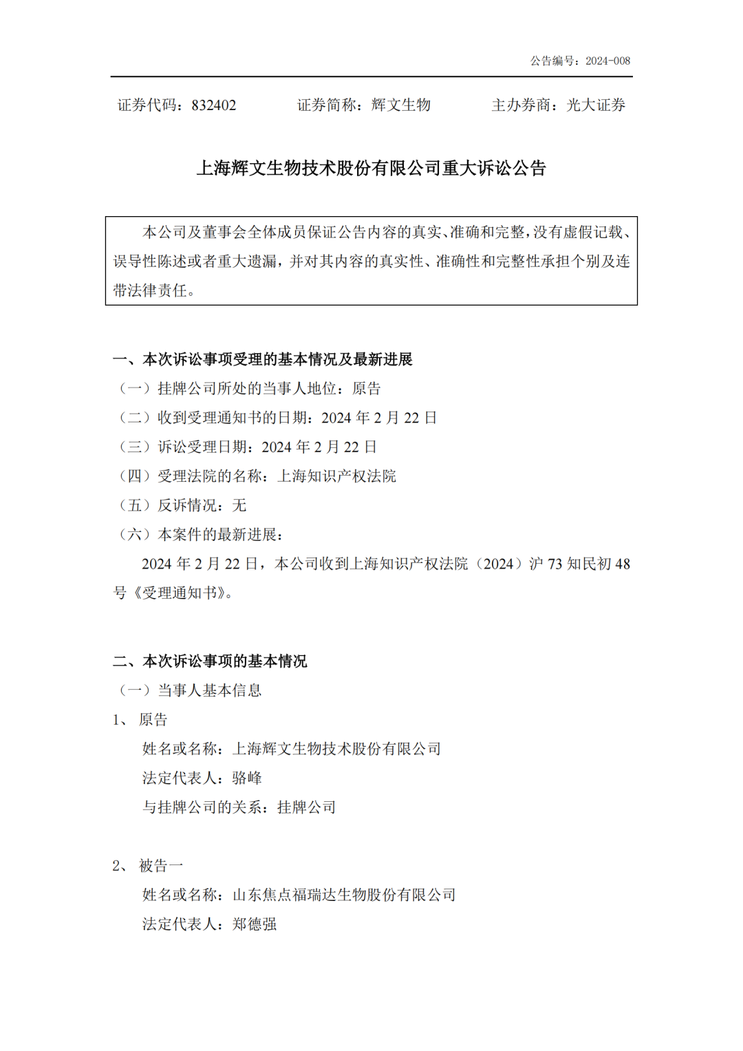 事件的起因是在今年1月和2月,辉文生物先后两次发布了重大诉讼公告,认为由焦点福瑞达生产、怀威实业代理销售的银耳多糖原料,涉嫌侵犯了自己两项发明专利的专利权,包括“银耳杂多糖及其提取物、制备方法和用途”发明专利和“银耳杂多糖或其提取物的新用途”发明专利。