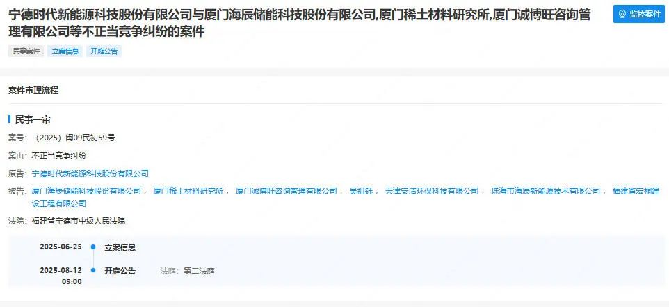 近日,宁德时代一纸诉状将海辰储能告上法庭,这场即将于 8 月 12 日开庭的案件,让两家企业长达五年的恩怨情仇再度成为焦点。案件涉及不正当竞争纠纷,被告方除海辰储能及其董事长吴祖钰外,还包括厦门稀土材料研究所、珠海市海辰新能源技术有限公司等多个主体。
